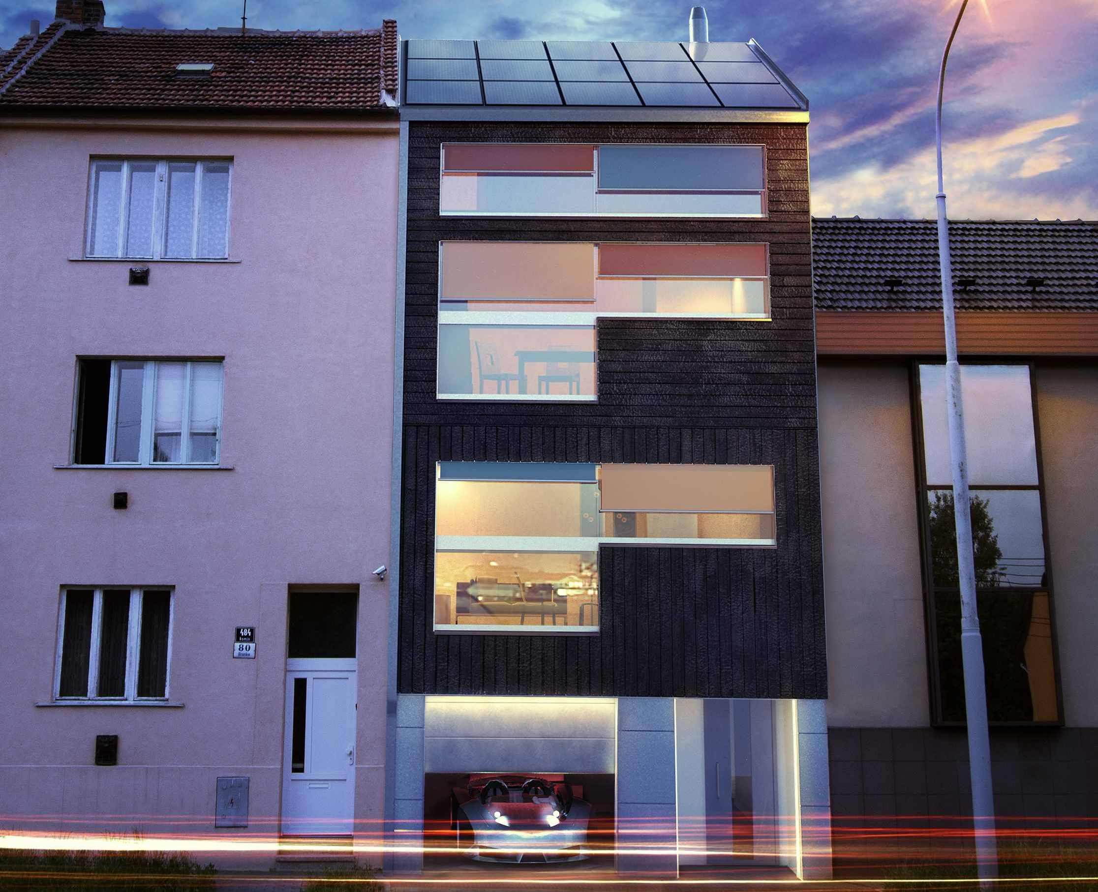 Dovedete si představit rodinný dům postavený do proluky pouhých 5,5 m se dvěma samostatnými byty pro 2 a 4 osoby? S tímto nesnadným úkolem se museli vypořádat projektanti ze společnosti Vize Ateliér, s.r.o. a zvládli to na výbornou! U rodinného domu se podařilo dosáhnout standardu energeticky plusového domu. Je to tedy první dům splňující tento standard dle nejnovější ČSN 73 0540!