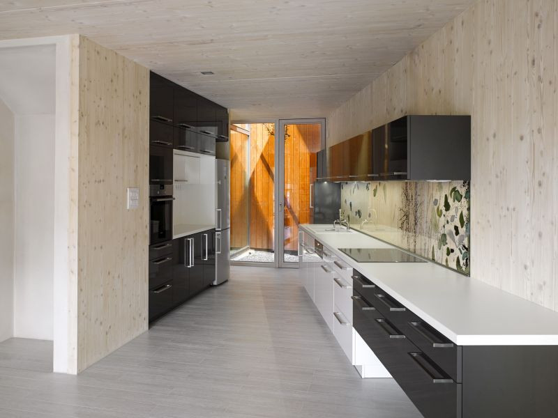 ... jako dřevo upraveného bezbarvými nátěry, povrchově stárne a mění se jeho odstín. Takové proměny v čase mohou být velmi zajímavé a budou postupně proměňovat náladu interiéru. Dřevo však bude poměrně náchylné k poškození povrchu. Kdo si na takové dobrodružství netroufá, má na výběr: přírodní oleje, včelí vosk, hliněné omítky, sklo, případně jejich kombinace – možností je celá řada a záleží vždy na osobním vkusu toho, kdo dům bude obývat. Několik možností a ukázek najdete v popiscích fotografií.