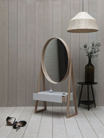 Staré toaletky jsou pro svůj nepomíjející půvab pořád v kurzu a dokonce jsme svědky, že se dočkaly modernizace, tvarového zjednodušení a výrazového omlazení. Příkladem může být velké stojací eliptické zrcadlo nazvané Iona Cheval z dílny britské společnosti Pinch Design. Zrcadlo v dubovém masivním rámu je součástí toaletního stolku s matně bílou odkládací plochou. Celek zdobí přiznané mosazné nýty.