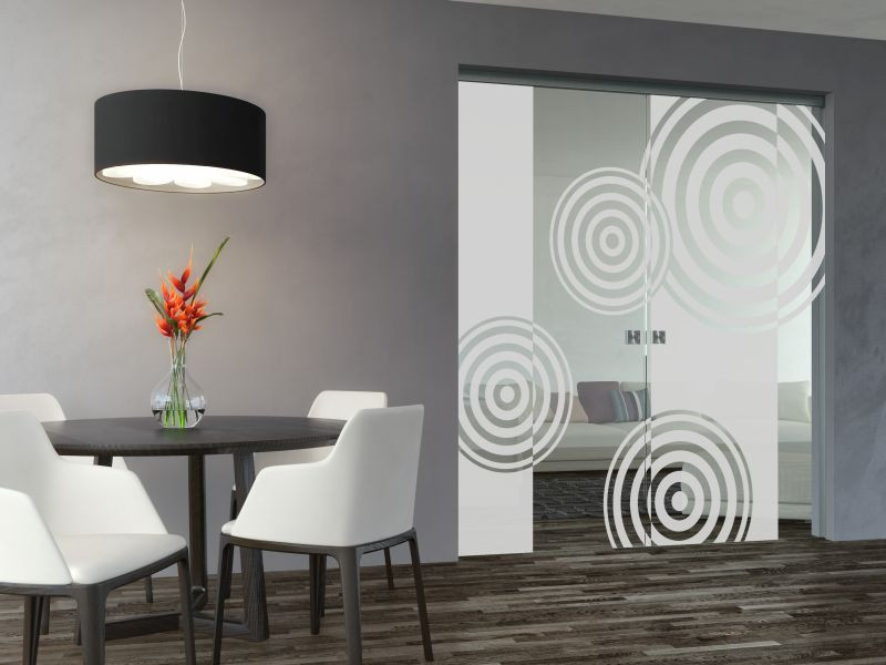 Matné bubliny, lesklé bubliny, kroužky anebo jakékoliv jiné motivy na sklo umožňuje například metoda pískování. Čiré sklo je vystaveno proudu speciálního jemného písku s příměsí hliníkových částic.