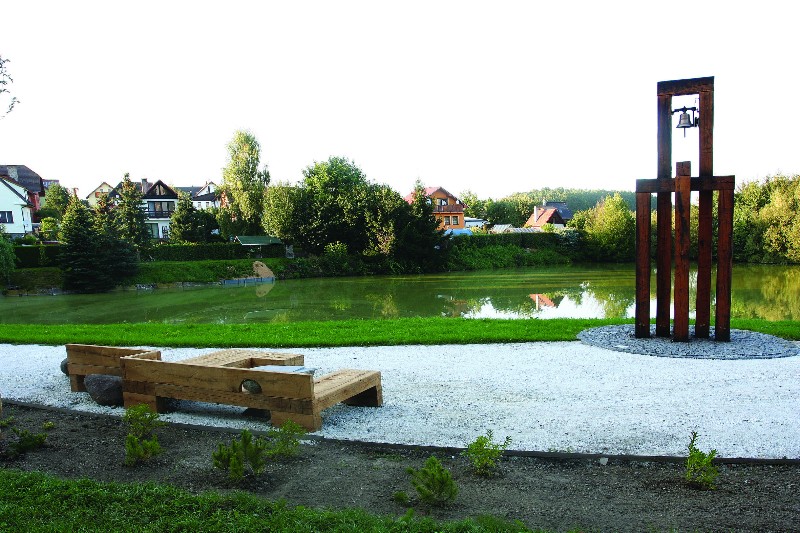 Základním materiálem je dřevo a kámen, masivní dubové hranoly nesou stopy opracování pilou a sekerou. Kameny jsou dovezeny z blízkého okolí, velmi dobře ladí se vzhledově příjemným a teple působícím dřevem. Kámen je použit i jako doplněk pro oživení celku – jednou je podhlavníkem na lavici, podruhé, zavěšený nad studnou, nositelem šifrovaného sdělení. Dnes plnohodnotné a nevšední centrum obce se kromě jiného stalo také místem vyhledávaným svatebčany z Klatov, kteří se zde často fotí. „Na návsi se zastavují ti, kteří procházejí obcí nebo projíždějí na kole. Kuriozitou a současně vyznamenáním pro mě je, že svatby, které se uskuteční v Klatovech na radnici, se někdy jezdí fotit tady před tu zvoničku na plácek s pozadím rybníka,“ uzavírá sochař.