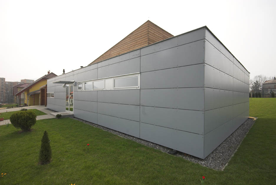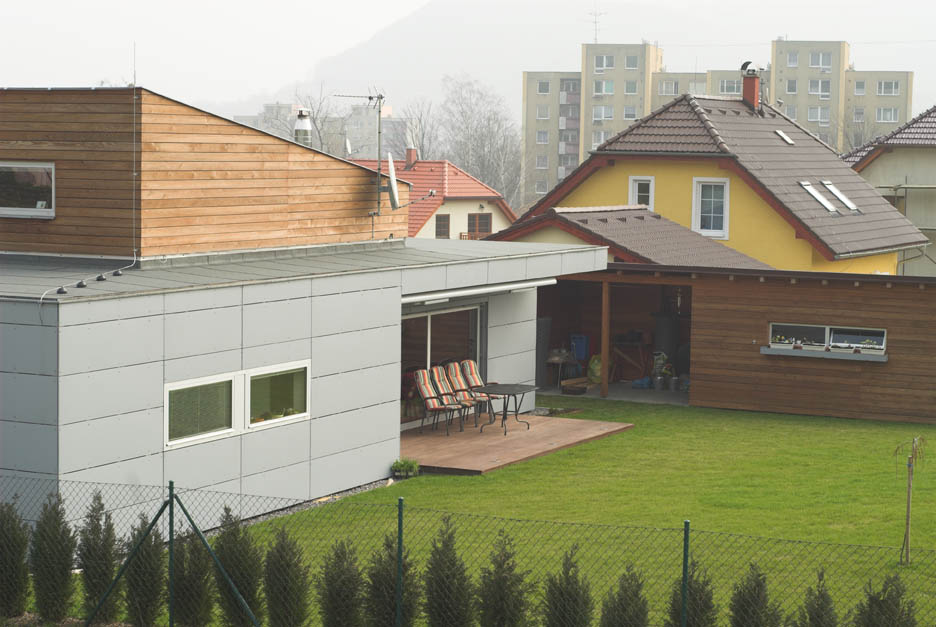 Mezi zástavbou pod beskydskými svahy se dům vyjímá nejen nekonvenční kombinací pultových střech, ale i technologií své výstavby. Nepřekvapí, že se jedná o montovanou dřevostavbu, hrdě přiznanou ztvárněním fasády.