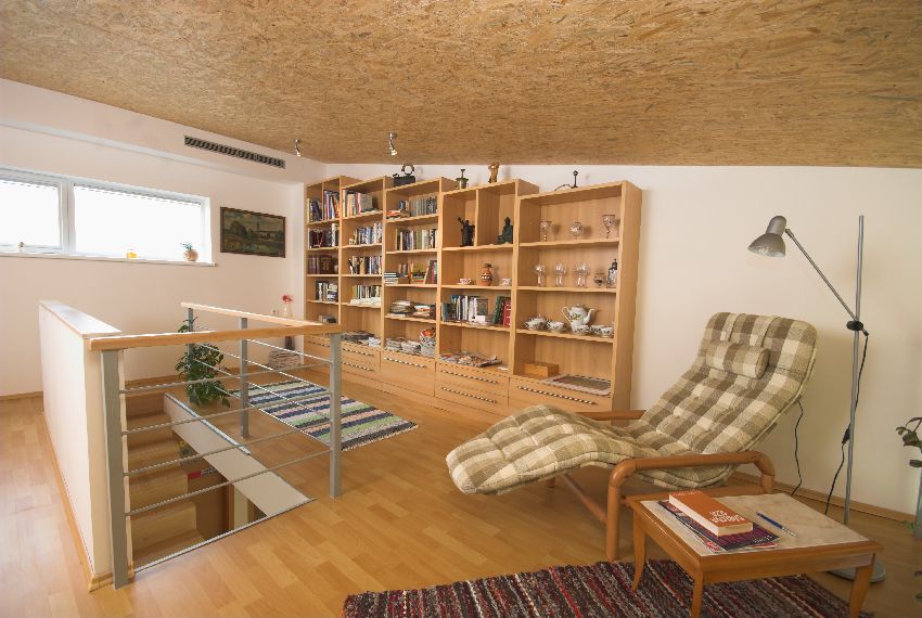 Dům je v současné podobě určitým kompromisem mezi patrovou stavbou a bungalovem. Obytná část včetně obou ložnic a pracovny je sice umístěna do přízemí, ale už zmíněné schodiště vede na galerii, která slouží pro práci i odpočinek. Příjemně se tu odpočívá s knížkou v ruce, ale stejně dobře tento prostor poslouží i jako malá krejčovská dílna. Díky tomu, že je galerie propojena s přízemím, je tu v zimě velmi rychle teplo, zvláště pokud se topí jenom v krbu, odkud se teplo rozvádí potrubím po celém domě. Jinak dům vyhřívá také malý plynový kotel připojený na podlahové topení a rekuperační jednotka, která se stará i o větrání. V zimě se tak vlastně stále větrá, aniž by ale z domu unikalo teplo. Z vlastní zkušenosti musím říct, že ovládání rekuperace není nic složitého: sice jsem určitou dobu chodila po domě s manuálem v ruce, ale pochopit funkci není o nic složitější než naučit se ovládat modernější televizi.