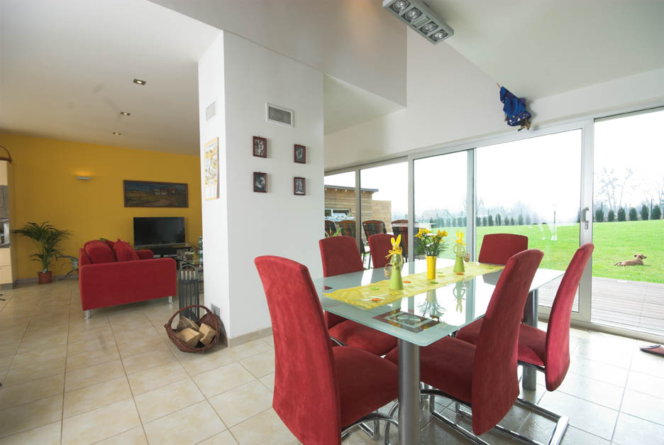 Dům je řešen jako nízkoenergetický, takže významným zdrojem tepelné energie je slunce. To nám do obytného prostoru proudí díky velkému prosklení v obývacím pokoji. V létě jsou posuvné dveře na terasu stále otevřené, takže můžeme volně přecházet z domu do zahrady. Protože jsme podlahu v obytné části domu vyřešili pomocí dlažby, nemusíme ani střídat obuv – chodíme prostě naboso, doma i venku. Až trochu povyroste živý plot, chtěli bychom ještě doplnit stavbu zahradního domku o malé domácí wellness centrum.