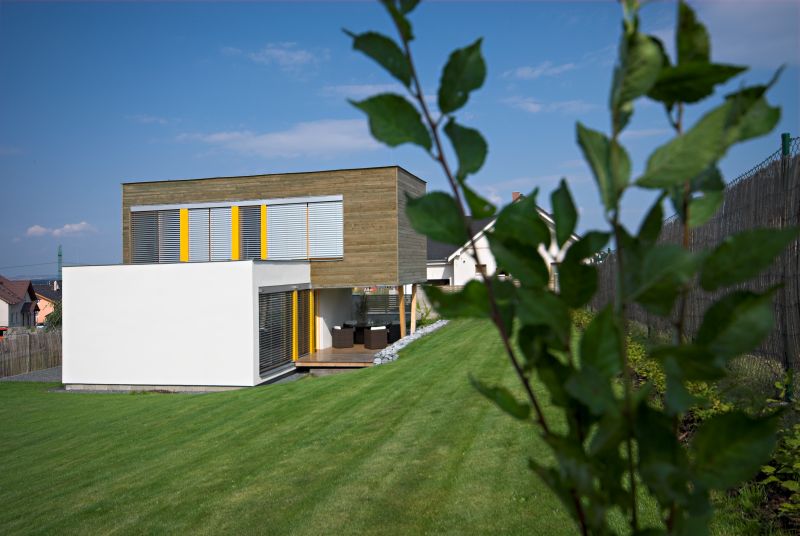 Dům byl kompletně dokončen zhruba za devět měsíců. Stěhovat jsme se mohli i dříve, ale nespěchali jsme a počkali jsme si i na dořešení chodníků a terasy. Rozvržení interiéru bylo dáno už v projektu, barvy, konkrétní nábytek a doplňky jsme si už vybírali sami a leccos jsme s architektem konzultovali. Na efektní kombinaci barevné stěny v obýváku se žlutými okny a nazelenalým dřevem nás přivedl on. Prostor tak působí velmi útulně. Za charakteristický prvek našeho domu považuji dřevěný trám, takzvané „superztužidlo", které prochází přes obě podlaží a matně se rýsuje za skleněnou copilitovou stěnou. Díky těmto dvěma prvkům je i chůze po schodišti estetickým zážitkem.