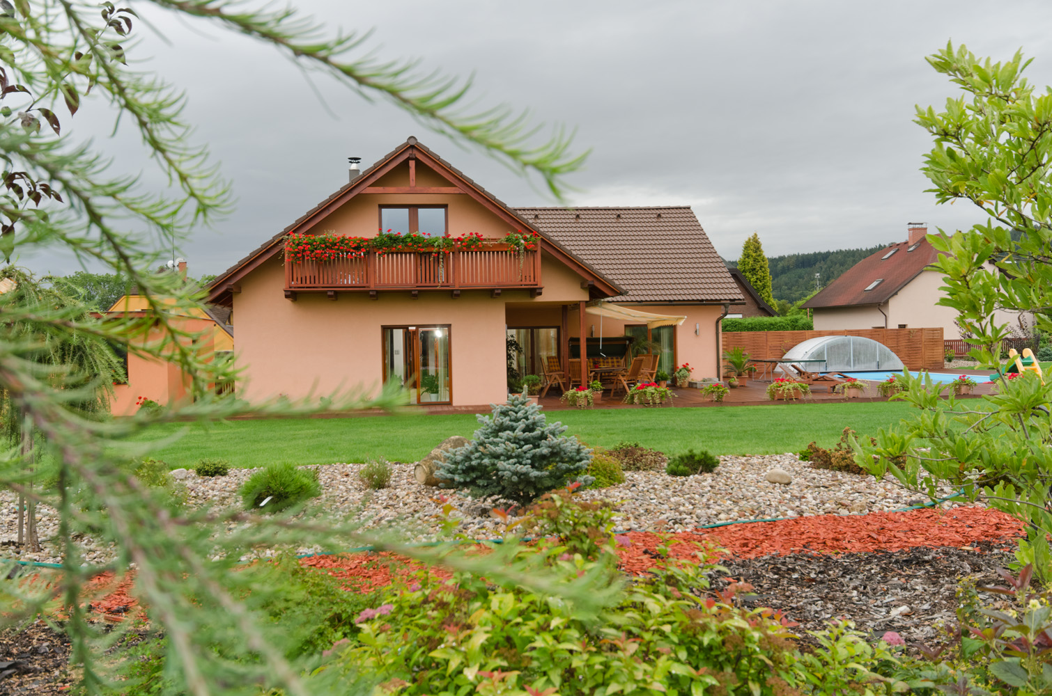 Místo garáže, která se nám zdála vždy zbytečná, máme přístřešek pro dvě auta a před domem zpevněnou plochu pro stání dalších šesti aut – hlavně kvůli návštěvám. Jelikož máme zahradnické centrum, zahradu jsme si budovali svépomocí a opravdu hodně nám pomáhal tchán, pro kterého je práce na zahradě velkým koníčkem. Na skladování kol, sekačky a jiných nezbytností jsme si ještě nechali postavit zahradní domek.