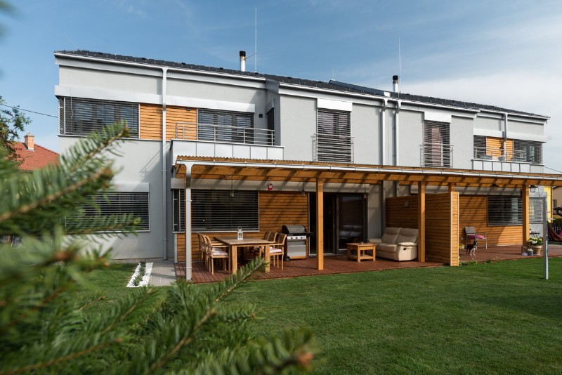 Praha je pro nás s veškerou dostupnou infrastrukturou ideálním místem k životu. Na pozemku, kde dnes stojí nová dřevostavba, býval zděný rodinný dům, kam se vešla celá naše rozvětvená rodina. Po smrti manželovy maminky jsme však začali uvažovat o změně a jako nejlepší řešení se ukázalo dům zbourat a postavit na jeho místě nový objekt dvojdomu. Čekala nás však zdlouhavá cesta, plná různých průtahů a byrokracie, což celý proces o řadu měsíců protáhlo. Na parcelu uprostřed původní zástavby se totiž vázala spousta regulativů a my přišli s návrhem zcela atypickým. Schválení projektu tedy nakonec vyžádalo šest výjimek týkajících se hranice pozemku, jeho dělení, zastavěné plochy, připojení komunikace, garáže a podobně.