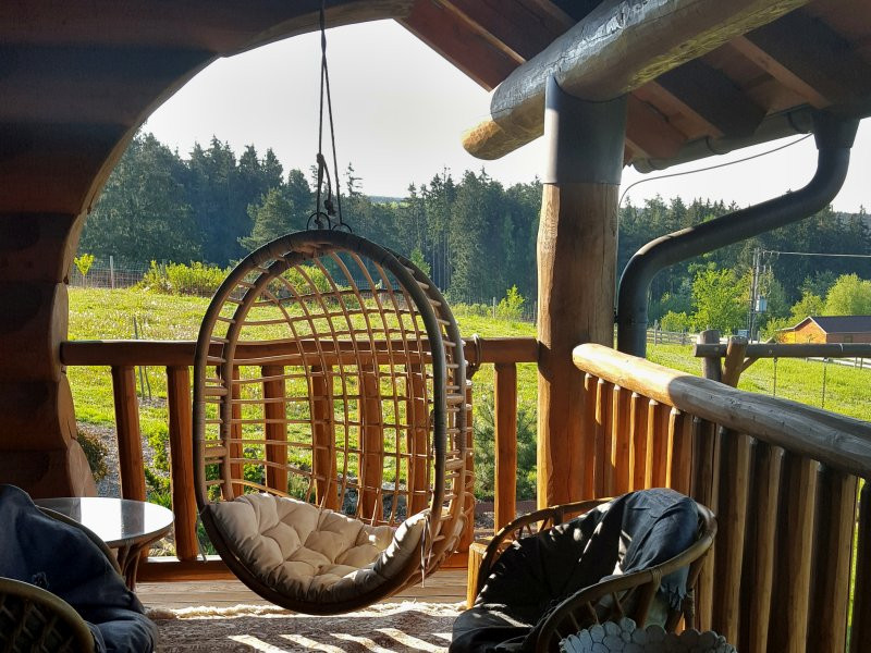 Také jsme se nenechali přemluvit a nemáme zábradlí u schodů do patra, takto působí celek mnohem volněji a otevřeněji... Ale kdybych stavěla takový srub ještě jednou, udělala bych ještě o trochu hlubší terasu. Tu totiž považuji také za obytný prostor, máme tam i koberec - zmíněný peršan, všechno sladěné s interiérem, prostě další obytné místnosti. Ale možná toto přání ještě někdy nějakým způsobem vyřešíme. A výhled, který máme do celého okolí je „detailem", který nelze penězi zaplatit!