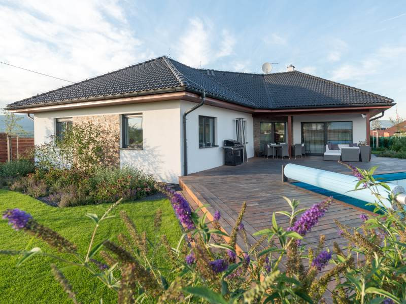 Jde o dům, který nepodléhá módním vlnám. V jednoduchosti je krása. Kromě variabilní fasády je dalším zajímavým prvkem kontrastní tmavá střecha i okna s kaštanově hnědým nátěrem kvůli souladu s okolní zahradou. Neopominutelným prvkem zvyšujícím atraktivitu domu je rozlehlá, částečně zastřešená terasa, na niž v obou našich příkladech navazuje na bazén. A není to náhoda – domy totiž stojí v sousedství a jejich majitelé jsou příbuzní.