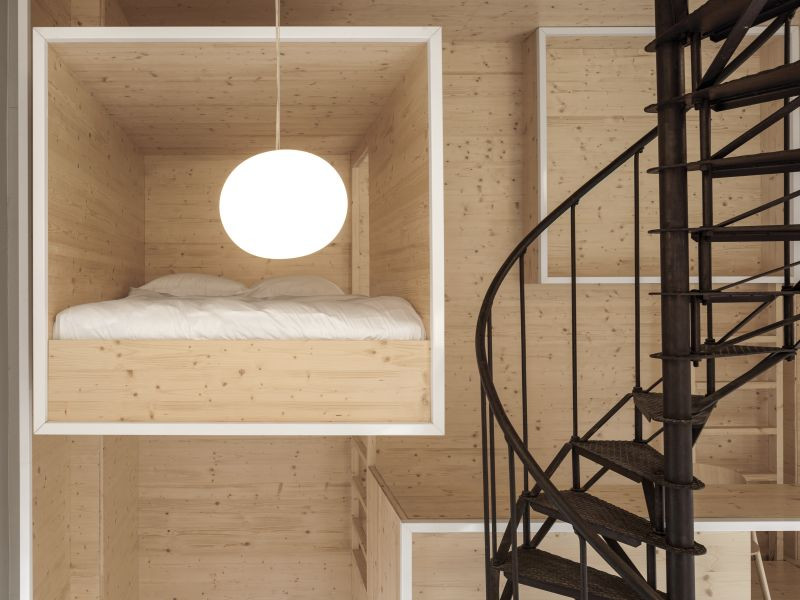 Výchozím bodem celého konceptu je instalace, která spojuje dva světy v jednom prostoru. Na jedné straně je vertikální konstrukce z dřevěných objemů sahající až po strop věže, na straně druhé je čistě bílý prostor. Dřevěná část zahrnuje spíž, sklad, stůl a válendu. Funkce jsou naskládány na sebe, aby uživatel mohl vnímat věž v různých úrovních. Pomocí malých žebříků pak může prolézat jednotlivými objemy. Každá úroveň poskytuje novou perspektivu a jiný výhled na okolní svět. Veškeré další příslušenství jako je dalekohled, křeslo a lampy jsou stejně jako samotný prostor kompletně bílé, aby efektně kontrastovaly s dřevěnou konstrukcí. Monumentální spirálové schodiště vedoucí do kopule je renovováno a svojí sytě černou barvou je výrazným akcentem interiéru, čímž přispívá k pohádkové atmosféře celého místa.