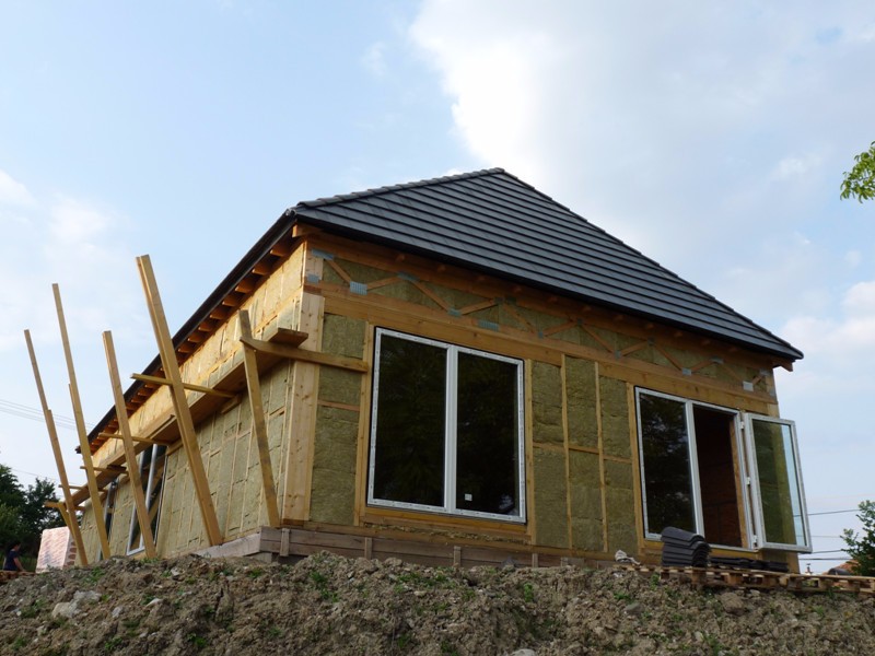 Při zakládání sendvičové dřevostavby nebylo třeba hledat komplikované řešení k eliminaci tepelných mostů jako při zděných stavbách. Na samotnou dřevěnou statickou konstrukci bylo použito stavební řezivo. Na dotvoření jednotlivých konstrukcí pro získání tepelně izolačních vlastností pomůže kamenná vlna, která má až pětinásobně vyšší tepelný odpor než dřevo. Rámové a svislé konstrukce, podlahový rošt, příhradové vazníky stropu a krokve byli vyplněné deskami ROCKTON. Po dokončení pláště šikmé střechy následovala realizace fasády. Na již existující sloupovou konstrukci obvodové stěny byly namontované desky DHF, které jsou několikrát difuzně otevřenější. Na ně byl ukotvený izolant FRONTROCK MAX E „na sucho".