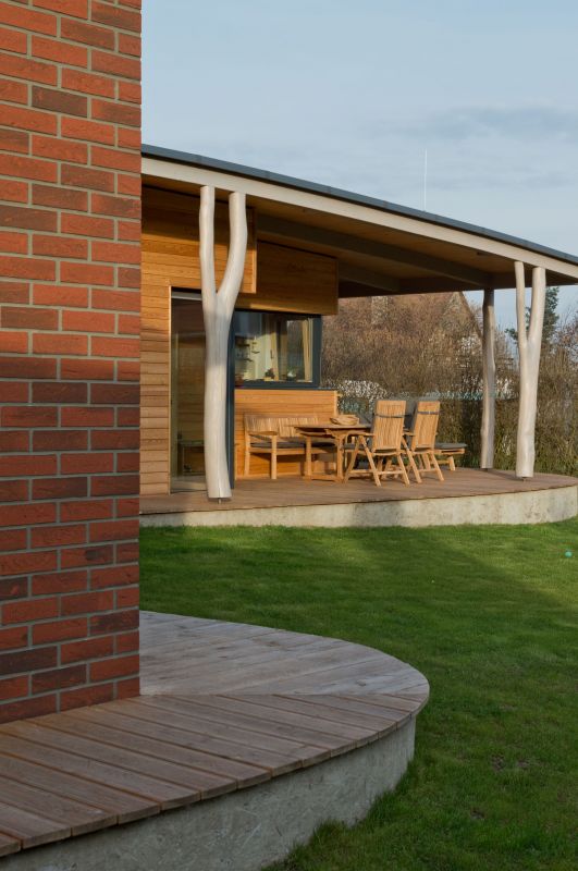Od počátku jsem věděl, že se mi nelíbí takové ty hypermoderní „škatule", co se dnes staví. Kompaktní krabičky od sirek, aby z nich co nejméně unikalo teplo, s velkými vnitřními skleněnými nebo kamennými plochami, kde se bojíte něco položit, abyste neudělali nepořádek. Měl jsem celkem jasnou představu o jednoduchém domě ve tvaru L a paní architektka mě hned při prvním setkání na pozemku přesvědčila, že celý musí být otevřený slunci. Kromě té jednoduchosti jsem měl také přání, aby dům byl charakteristický nějakým specifickým nápadem. Projekt tedy prošel několika verzemi, které architektka poctivě kreslila – například s částí terasy zakrytou plachtou, jakoby tam přistála vzducholoď, nebo s terasou ve tvaru listů... A mě naše společná sezení a diskuse ohromně bavily. Pak jsem přišel na to, že dům stavíme v lesnaté oblasti, kde bývaly trempské osady, co kdybychom tedy střechu podepřeli sloupy z přírodních kmenů. Za dva měsíce jsme se znovu sešli a ona položila přede mě plány s tím, že se mi je trochu bojí ukázat. Ke sloupům inspirovaným lesem organicky přidala křivku a tak vznikl mírný střešní oblouk, který na jedné straně překrývá terasu a na druhé vytváří kryté stání pro dvě auta. A já jsem hned věděl, že to je ono! Od té chvíle jsme nic neměnili, pouze z úsporných důvodů mi pan Biskup zmenšil přesahy střechy a verandu, ale i tak jsou víc než dostatečné.