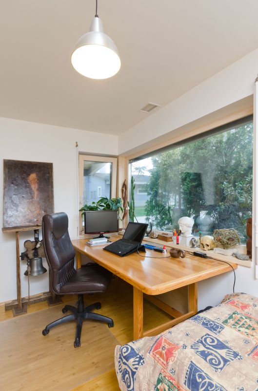 Náš přízemní bungalov je členitý, poskytuje tedy hodně ploch pro únik tepla, přesto dosáhl nízkoenergetických hodnot, na hranici pasivního domu. K vytápění jsem zvolil elektrické sálavé panely z hořického pískovce, které i na pohled ladí s dřevěnými stěnami. V pískovcových panelech jsou vyfrézované drážky, kterými vede odporový topný drát, a na rozdíl od plechových radiátorů mají mnohem delší setrvačnost, než vychladnou. Dům bohatě vytopí čtyři tělesa, v koupelně a zádveří máme navíc podlahové topení. Střešními solárními panely ohříváme vodu v bojleru.