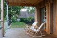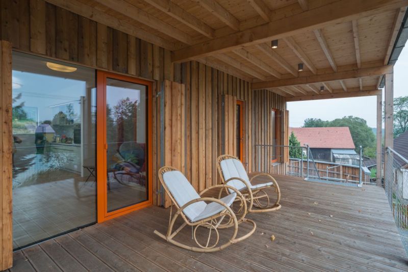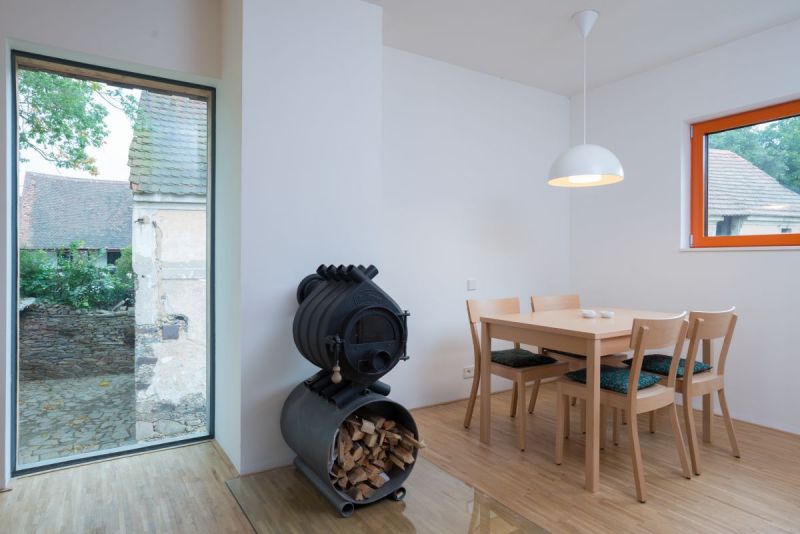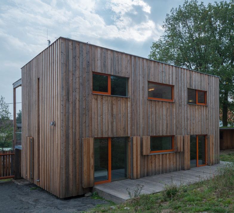 Na doporučení jsem pro realizaci oslovil inženýra Trgalu a jeho rodinnou firmu. Panely předvyrobené v dílně se pak během tří dnů na místě smontovaly. Na fasádu jsme použili překrývaná prkna, místní architektonický prvek. Oranžová barva okenních rámů a interiérových dveří koresponduje s režným zdivem na okolních objektech.