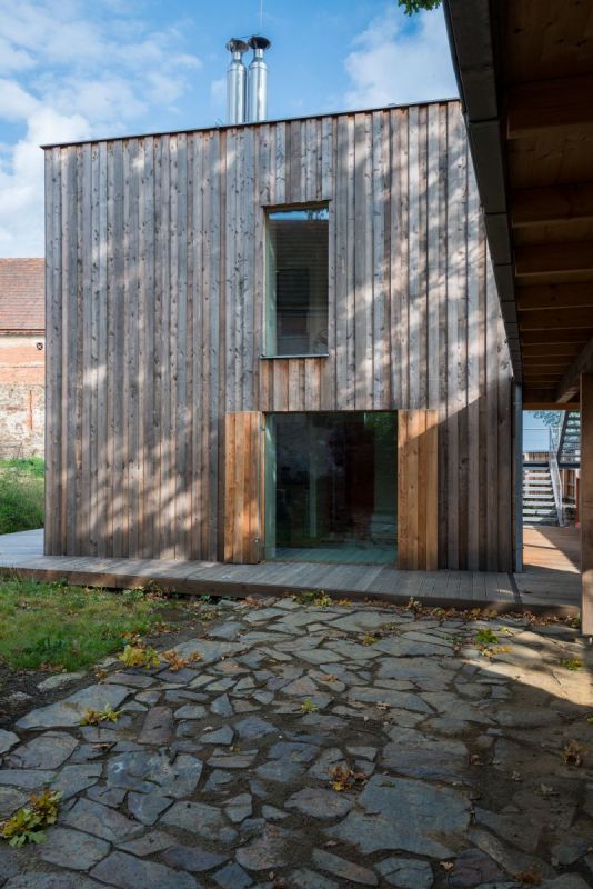 | Fasáda: | překládaná nehoblovaná modřínová prkna bez povrchové úpravy |
