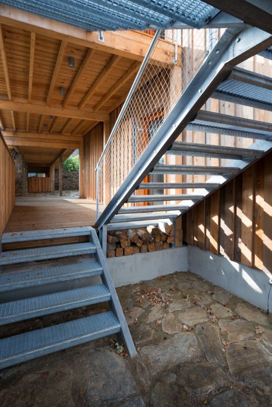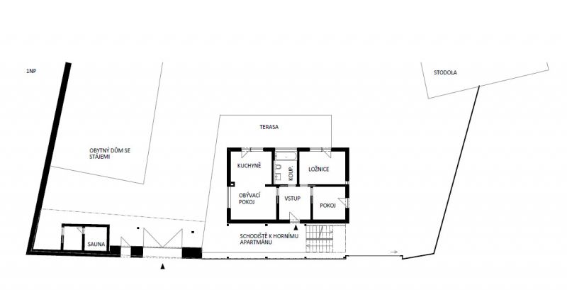 Díky investorově puntičkářství" se projekt měnil a upravoval ve všech svých projekčních fázích, až se nám ho nakonec podařilo vyladit téměř k dokonalosti. Jen na studii jsme ale pracovali skoro rok. Při našich schůzkách nás omezovala absence jakéhokoliv zázemí, proto jsme se nakonec dohodli rekonstrukci statku rozdělit na dvě fáze. V té první vystavíme na místě chlévů soběstačnou novostavbu, oprava ostatních objektů, už pak bude moci probíhat pomaleji. Novostavbu jsme koncipovali jako dva samostatné neprůchozí apartmány o identické dispozici a velikosti 3+kk. Horní apartmán disponuje krytou terasou orientovanou na jih, směrem ke vsi, a je přístupný po krytém venkovním schodišti. Spodní apartmán je naopak více orientovaný na sever, do dvora. Investor chtěl také saunu, která je umístěna v rohu parcely, přístupná od objektu „suchou nohou" pod plochou střechou s extenzivní zelení.