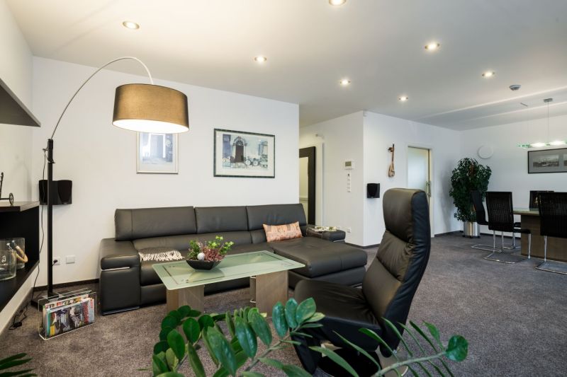 | Podlahová krytina: | dlažba ve vstupu, WC, kuchyni a koupelně se saunou, ostatní prostory koberce |