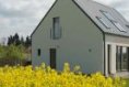 Směrem dovnitř: vnější zateplovací systém s omítkou v kombinaci s dřevěným obkladem, Fermacell, rámová konstrukce tvořená z KVH hranolu, parotěsná fólie, Fermacell