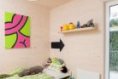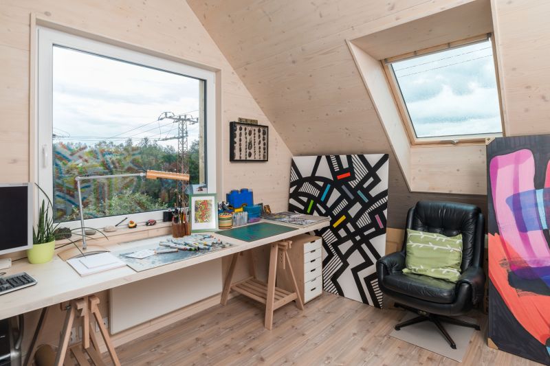 Při hledání pozemku jsme se postupně vzdalovali z Prahy a to nejen kvůli financím, ale i z důvodu vzhledu volných parcel. Nechtěli jsme žádnou rozparcelovanou louku. I když je tenhle pozemek opravdu v hodně prudkém svahu, jeho umístění v bývalé chatové kolonii nás dostalo. Na pozemku bylo spoustu vzrostlých stromů a v okolí nehrozilo, že nás po čase obklopí podnikatelské baroko. Také tu bylo dostatek místa jak pro dům, tak pro ateliér, který mám ještě do budoucna v plánu. Zatím se svou malířskou vášní sídlím v podkroví a ateliér kvůli malému prostoru nazývám „pastelkárna“.