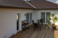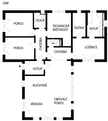 Vznikl bungalov ve tvaru písmene T, jehož vnitřní uspořádání respektuje přístup na pozemek, i tolik žádané provázání interiéru se zahradou přes rozlehlou terasu. Ta svým půdorysným tvarem zase tvoří spíše písmeno L a obepíná dům ze dvou stran. Orientována je ideálně – na jihovýchod a jihozápad. Terasa, která byla naším zásadním požadavkem, se rychle stala nejdůležitějším místem našeho nového bydliště. Došlo tak k propojení vnitřní části bungalovu se zahradou. Dům má dvě hlavní obytná centra – jedno pro rodiče a druhé pro děti. Fyzicky tyto zóny odděluje technická místnost. Společně se pak scházíme ve společném obývacím prostoru.