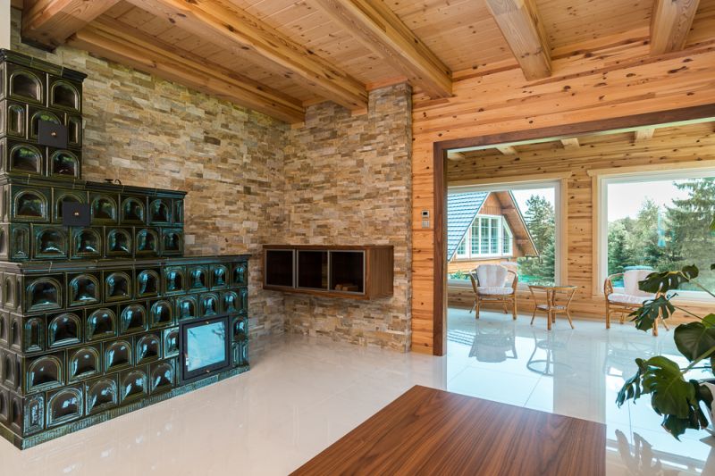 Topení: elektrický kotel, podlahové topení, kachlová kamna