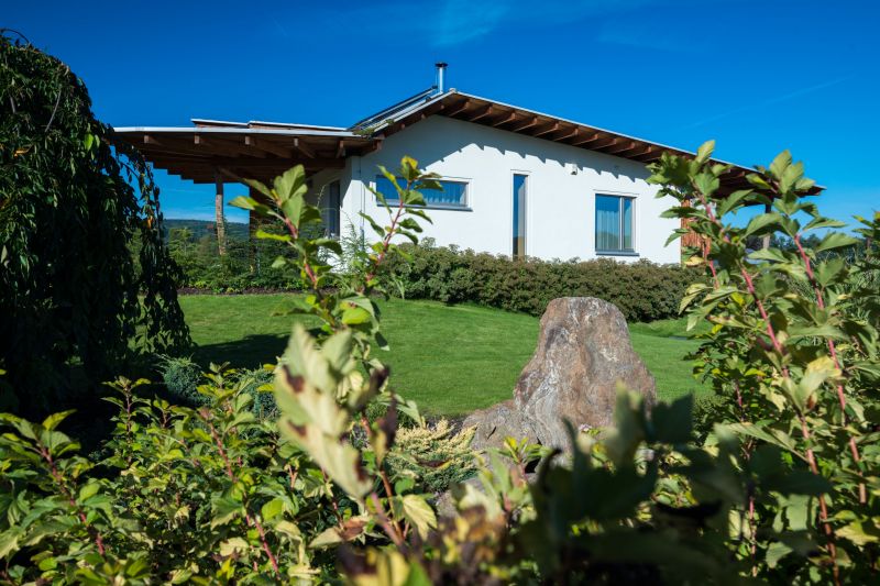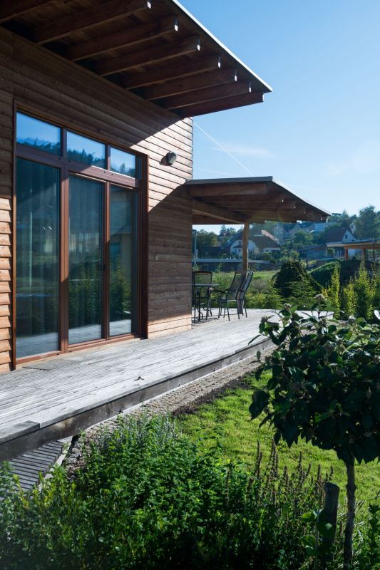 Přízemní bezbariérový dům je specifický svými výraznými přesahy střechy, které chrání fasádu domu, na jihu stíní slunce a déšť a na severu kryjí parkovací stání. Prodlužují čas strávený venku, jelikož chrání před nepřízní počasí. Terasa je pro svoji orientaci na jihovýchod jako stvořená pro letní snídaně. Stavba je navržena jako pasivní s rekuperací tepla – prvkem, která považuji za skvělý a byl hlavním důvodem pro energeticky úsporný dům.