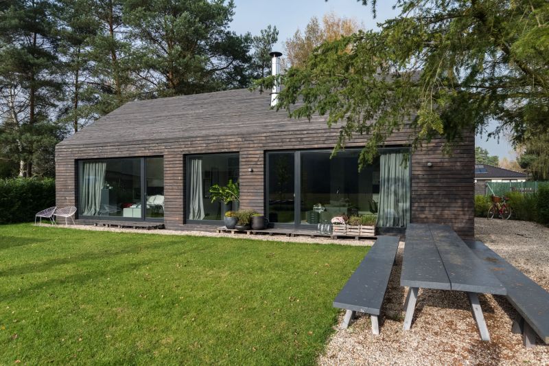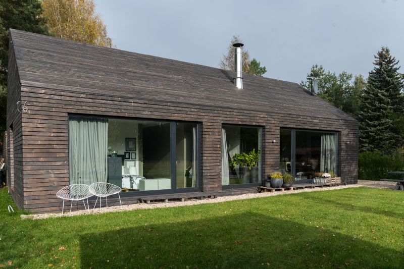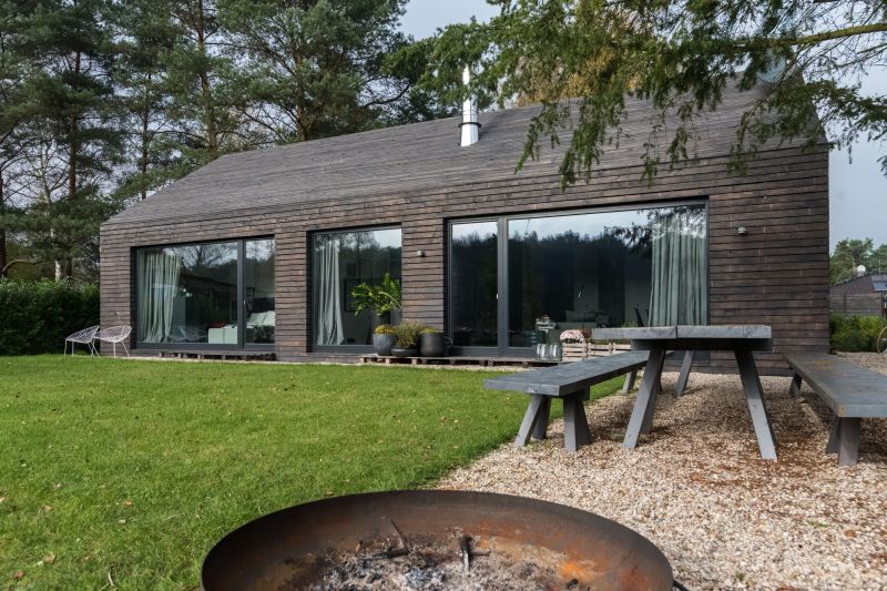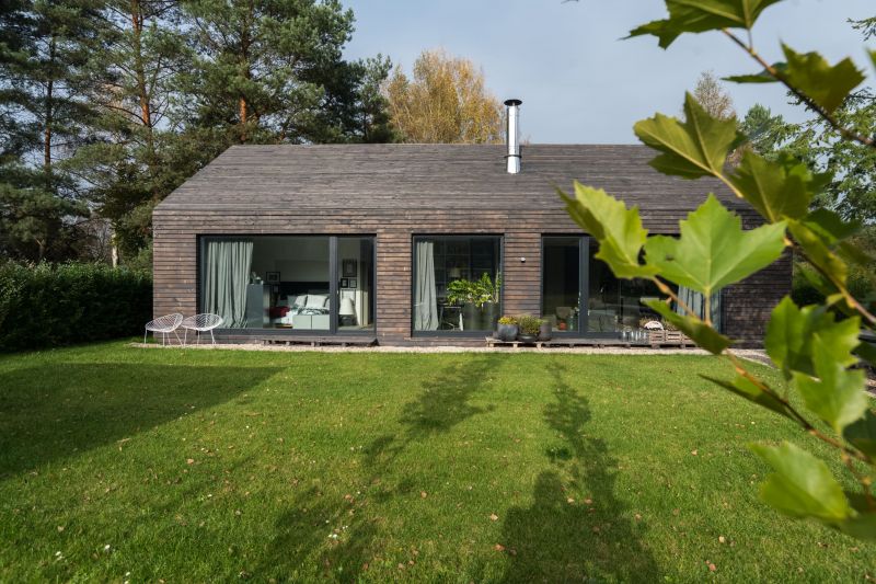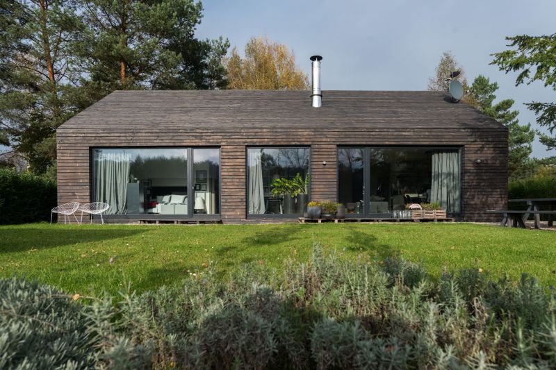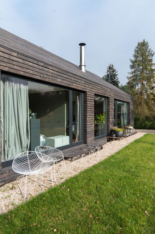 Pozemek ve staré zahrádkářské kolonii na okraji Kerského lesa byl přesně tím, co jsme hledali. Od počátku jsme věděli, že chceme žít v souladu a hlavně v těsném kontaktu s okolní přírodou. Proto je dům zcela otevřen na jižní stranu, směrem k louce a lesu a na severní fasádě, té do ulice, není umístěné ani jediné okno. I když jsem z počátku koketovala s myšlenkou ploché střechy, místní regulativy rozhodly o tom, že bude sedlová. Limitem pro nás bylo 120 m2 zastavěné plochy, která vycházela z velikosti pozemku. Protože jsem usilovala o to, aby dům co nejvíce zapadl do krajiny, musel být přízemní a jednoduše hmotově řešený, nejlépe celodřevěný.