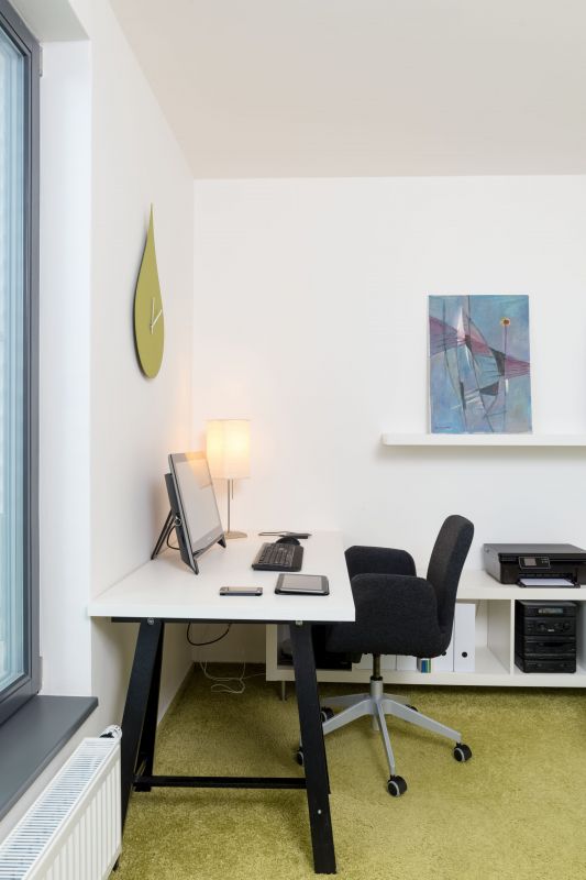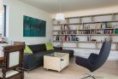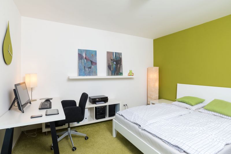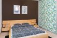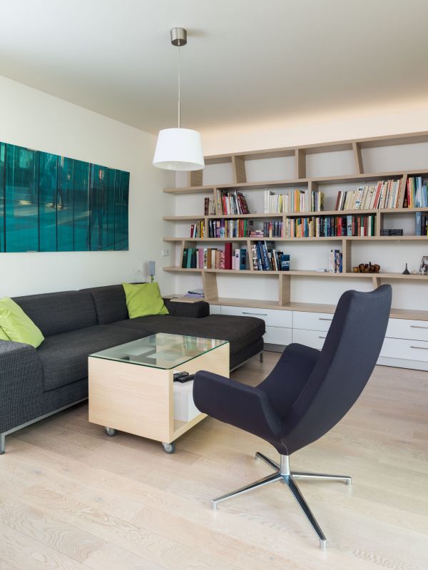 Podlahy: dřevěné bělený dub, velkoformátová dlažba, koberec