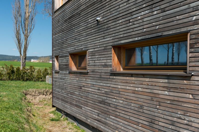 84 mm Novatop, 160 mm fasádní nosník, 80 mm tepelná izolace, 80 mm tepelná izolace, 60 mm latě horizontální (60/40), 60 mm tepelná izolace, difuzní folie kontaktní, 40 mm provětrávaná mezera, latě vertikální (40/60), 24 mm sibiřský modřín profil Rhombus