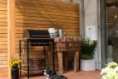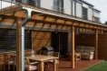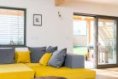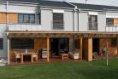 Obývací část je orientovaná na jih a navazuje přímo na terasu. Venku trávíme většinu roku a dveře i okna zůstávají málokdy zavřená. Přepážka mezi terasami krásně zajišťuje soukromí, zanedlouho přibude také plot oddělující jednotlivé zahrady. Parcela není velká, ale když jsme objednávali trávník a zadávali číslo 120 metrů čtverečních jen pro naši část zahrady, uvědomili jsme si, že to není vůbec špatné a celý projekt dopadl nad naše očekávání.