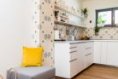 Dali jsme si záležet s výběrem zařízení, které je složeno převážně z originálních kousků vyrobených na míru, často českého původu, nebo získaných v bazarech. Jídelní stůl má například desku z teakové podlahy, obklady v koupelně a kuchyni jsou původem ze Španělska, nadšeni jsme také ze sedací soupravy na míru s velkými úložnými prostory a malou knihovnou.