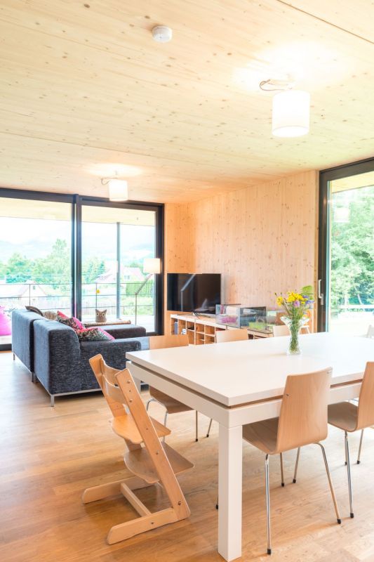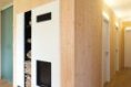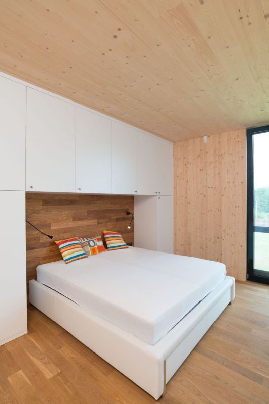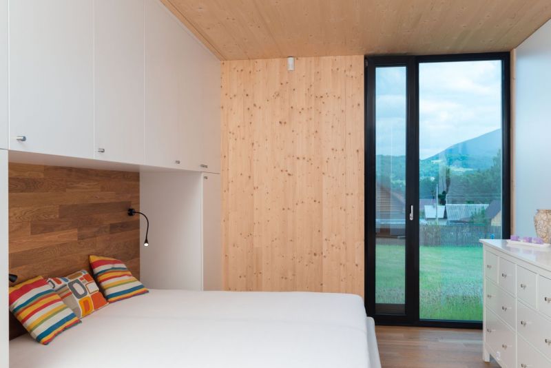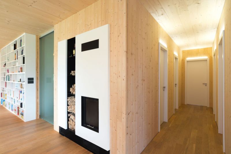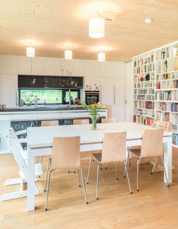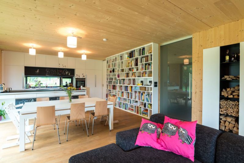 Zvolená technologie nám umožnila ponechat dřevěnou konstrukci v interiéru pohledovou, takže jsme se vyhnuli předstěnám. Z toho pro mě vyplynulo asi největší překvapení, pokud bych měl srovnávat život ve dřevostavbě s bydlením ve zdivu. Dřevo na stěnách i na stropě totiž více pohlcuje zvuk a vytváří tak mnohem útulnější a příjemnější prostředí. Na co naopak musíme dbát, je udržování vlhkosti alespoň na 50%. I naše malé děti tak vědí co je a jak funguje zvlhčovač.