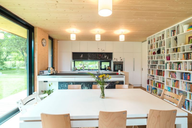 Půl roku od koupě pozemku jsme poprvé kopli do země, za dalšího půl roku byl pak dům připravený k nastěhování. Dalších šest měsíců trvalo ještě detailní promyšlení a výroba nábytku, takže žádný světový rekord v rychlosti výstavby se nekonal, i tak si ale myslím, že jsme to zvládli rychle. Projekt interiéru domu bohužel v praxi nebývá pravidlem, i když exteriér a interiér jsou dvě silně provázané a neoddělitelné věci. Samozřejmě při návrhu zohledňuji dispozice i předběžné rozvržení nábytku, ale ne každý klient se rozhodne dotáhnout tyto idey do konce. Jsou to ale právě detaily, které pak dělají dům domem. A interiér je pro obyvatele domu stěžejní, vždyť v něm tráví většinu svého času. My máme, až na drobné výjimky, veškerý nábytek na míru. Největším nepřítelem tak pro mě při zařizování domu byl čas, kterého tak nějak nikdy nebylo nazbyt.