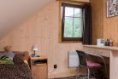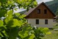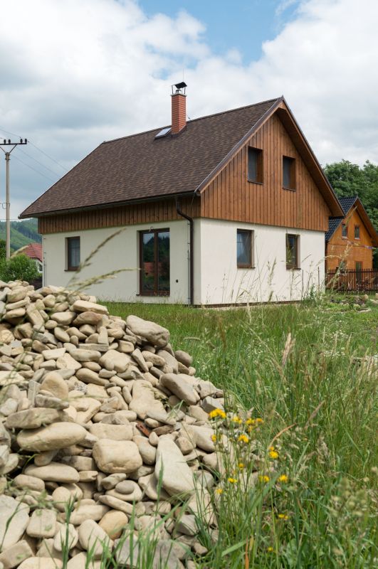 Fasáda: strukturovaná omítka, srubový obklad (štíty)