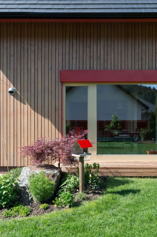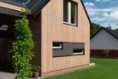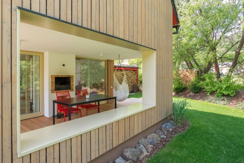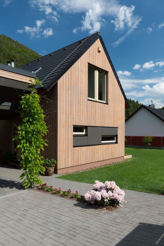 Fasáda: omítka, modřínový obklad PALIS, cementovláknité desky