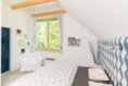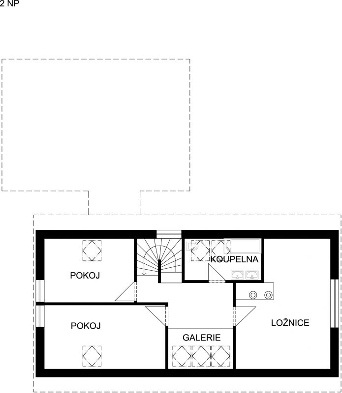 Skladba stěny (směrem zevnitř): sádrokarton tl. 12,5 mm, rošt předstěny + minerální vata 60 mm, OSB deska tl. 15 mm, konstrukce stěny z lepeného I-nosníku PALIS + celulóza 220 mm, DHF deska tl. 15 mm, provětrávaná mezera tl. 40 mm, vodorovný rošt 40 mm, modřínový obklad nebo cementovláknitá deska (8 mm) 24 mm