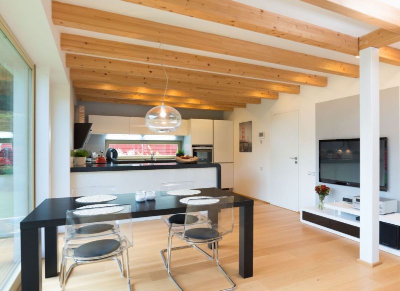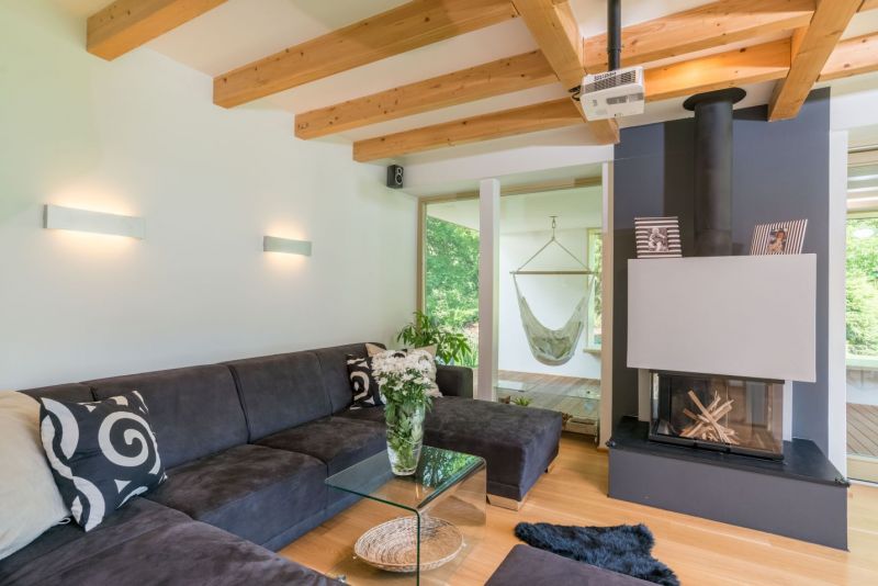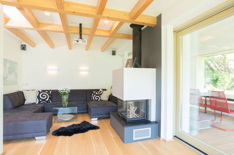 Obytný prostor je orientován na jih. Za slunečného počasí sem tedy prakticky pořád svítí a v zimě často vůbec není třeba topit. Díky galerii se navíc prohřívají pokoje v horním podlaží. Jsme teplomilní, takže nám nevadí ani teploty kolem 24 stupňů. V létě se k naší spokojenosti dům nepřehřívá, což přisuzujeme zejména okolním vzrostlým stromům, které teplotu efektivně snižují. Teplo v domě kromě slunce zajišťuje elektrické podlahové vytápění a příležitostně krb, který máme spíš pro atmosféru. Za loňský rok jsme za elektřinu (ohřev vody, topení, osvětlení a spotřebiče) platili kolem dvaceti tisíc.