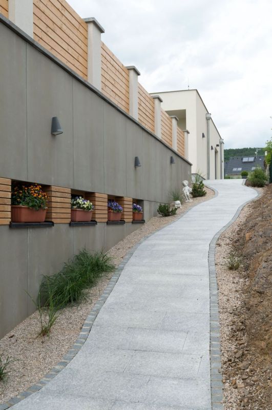 Tento pozemek se nám zprvu zdál úplně nemožný. Upřímně jsem si myslel, že by ho mohl koupit jen blázen. Převýšení pozemku a obrovská jáma uprostřed se ovšem částečně projevily na příznivější ceně, a tak jsme alespoň zapřemýšleli nad možností výstavby. Postupem času jsme zvažovali všechna pro a proti a nakonec dospěli k řešení: v dolní části parcely jsme vybudovali garáže pro devět aut a vytvořili tak platformu pro samotný dům a zahradu, která nabídla úplně nové možnosti. Z naprosto atypického pozemku, který se zdál být nezastavitelný, jsme tedy vybudovali jeden z nejlepších v okolí. Ostatní domy mají jen malé zahrady, varianta s garážemi však vytvořila prostor pro zahradu a perfektní soukromí. Navíc umožňuje schovat auta, která by normálně stála podél ulice a ubírala místo například pro zeleň.