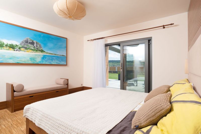 Středobodem obdélníkové dispozice je obývací pokoj s kuchyní, kde žijeme a který je místem rodinného setkávání. Z jedné strany pak přiléhá ložnice s koupelnou a z druhé království našich dcer navazující na boční hlavní vstup. Pro koncept domu byla zásadní orientace na jih a správné posazení ložnice. Naštěstí vše krásně zafungovalo a orientace postelí funguje pro nás oba s ženou na jedničku.