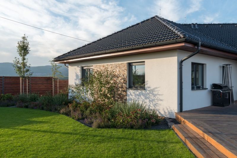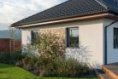 Fasáda: difuzně otevřená bílá omítka, břidličný obklad