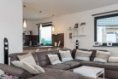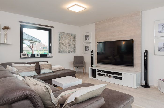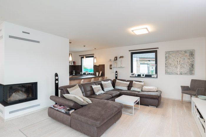 Barvy exteriéru by se měly odrážet v interiéru, takže i uvnitř jsme volili přírodní barvy v tlumenějších odstínech, jen tu a tam doplněné kontrastujícím prvkem. V interiéru jsme začali kuchyní, která je v obývacím prostoru dominantní – jakmile jsme se shodli na barvě cappuccino, světlé podlahy už byly jasnou volbou. V celém domě kromě ložnic je podlaha jednotná. Chtěli jsme vinyl – nezničitelnou, krásnou krytinu z jednotlivých kazet, které je možné v případě potřeby snadno vyměnit. Jen před sedačkou v obýváku je část dřevěné podlahy, opět tón v tónu.