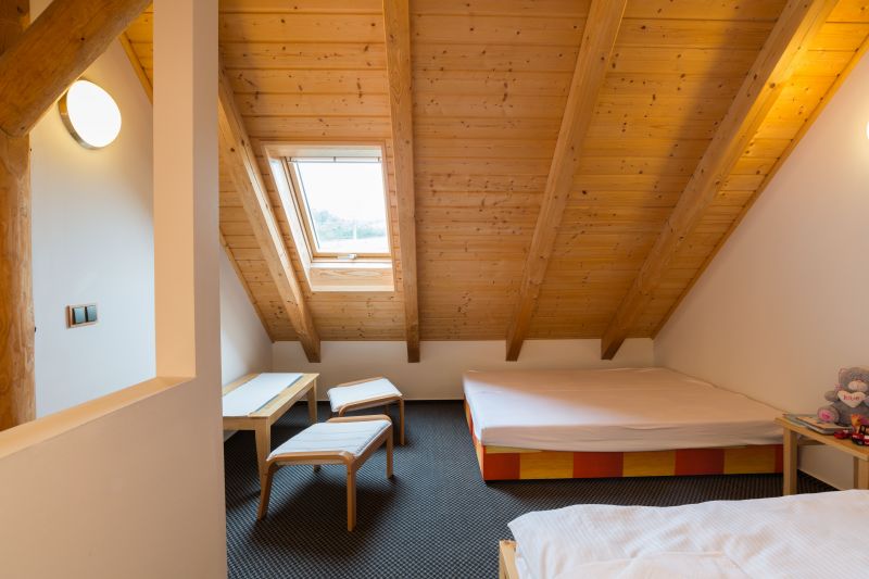 U takhle velkého, patrového srubu také bylo těžké předem odhadnout, jak bude dřevo při sesychání pracovat, takže v rámci záruky tu firma musela letos asi čtyři sloupy, u kterých už byly aretační šrouby úplně na doraz, vystojkovat a seříznout, abychom získali dalších pár centimetrů vůle.