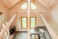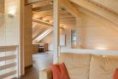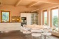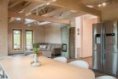 Dispozice společenské části měla být původně celá otevřená až do hřebene střechy, ale když jsme si uvědomili, jak krásný je z patra výhled, usoudili jsme, že by byla škoda o něj přijít. Nad kuchyní a jídelnou jsme tedy umístili strop, nad nímž vznikla otevřená galerie s útulným posezením a nádherným výhledem do krajiny.