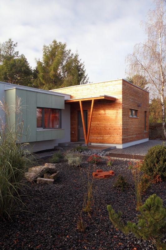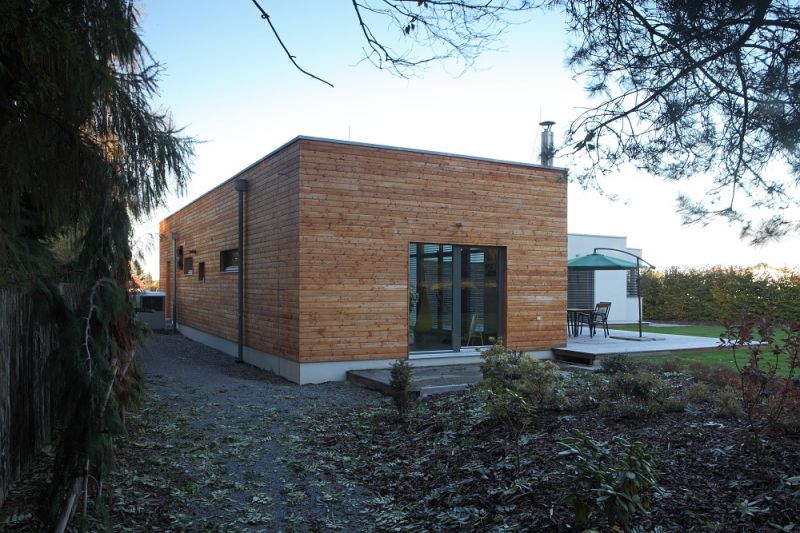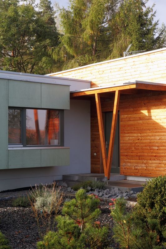 „Vždycky jsem tvrdil, že pokud bych musel stavět, tak jedině dřevostavbu, patrovou kostku," vyznává se Miroslav. „Ani nevím, jaká kritéria mě tomu přivedla; prostě mi byl dřevěný dům sympatický. To patro mi architekt rozmluvil kvůli začlenění domu do okolí. Teď jsem za to rád. Vlastně i za vyřízení stavebního povolení, autorský dohled nad realizací a hlavně za jeho invenci obecně."