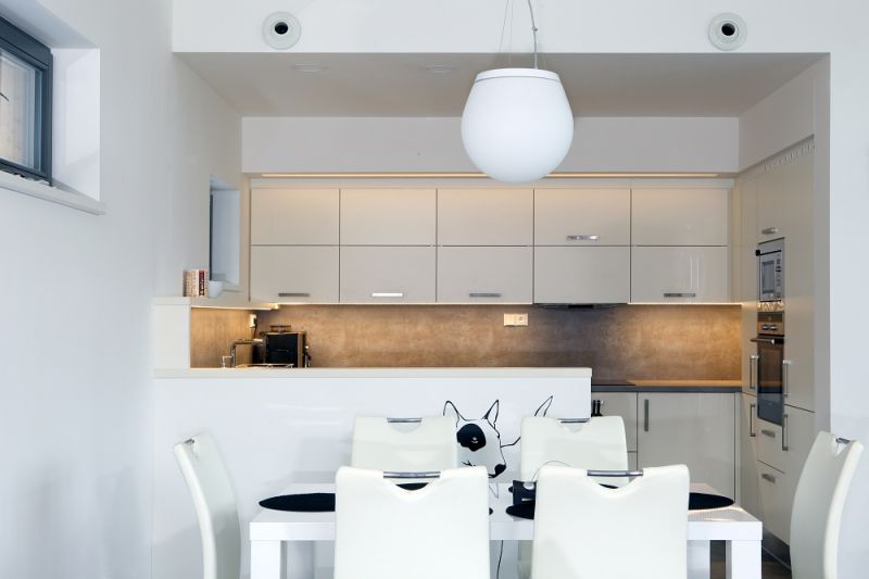 Pro představu – obytná plocha zabírá sto padesát pět metrů čtverečních, z nichž většina volnoprostoru bez příček obsáhla kuchyni, jídelnu, obývák i dvě chodby včetně zádveří. Objem vzdušnosti umocňuje i poměrně vysoký strop, sklánějící se jen před nutností prostoru zázemí.