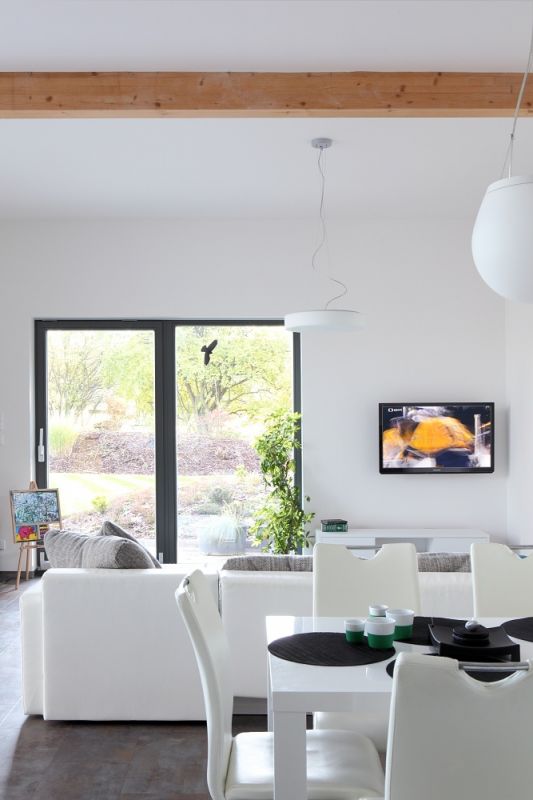 Vizuálně prostorová koncepce domu z ateliéru Davida Mateáska hledá v okolí jen těžko srovnání. Propojení vnějšku s vnitřkem a opačně vyvolává dojem přirozeného cyklu, mimovolného běhu věcí a dějů. Jako by dům promlouval se svými obyvateli a přenášel informaci do svého okolí. Tak přirozeně, jak by to v rodině mělo být. Koloběh vzduchu, barev a světla ve velkorysých proporcích stavby zosobňuje dynamiku, s jakou se v něm lidé probouzejí a usínají. Připomíná proměnlivost ročních období, která se jen pomalu kutálí za oponou prosklených stěn. „Během stavby snad nebylo dne, kdy bych číslo pana architekta nevytočil," vzpomíná Miroslav. „Stále jsem měl pocit, že to bude malé! Ale on mi se stoickým klidem stále dokola opakoval – nebude."