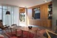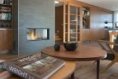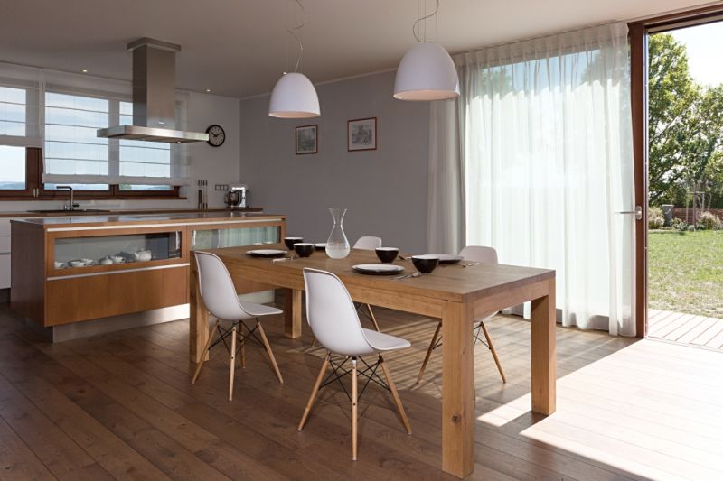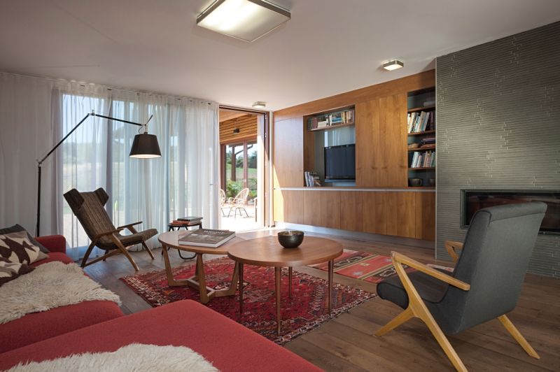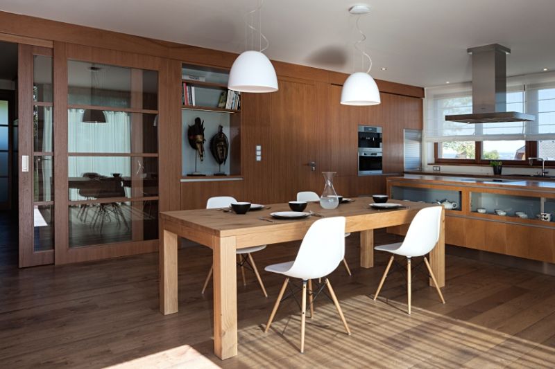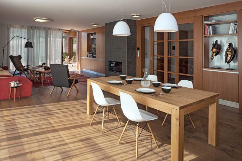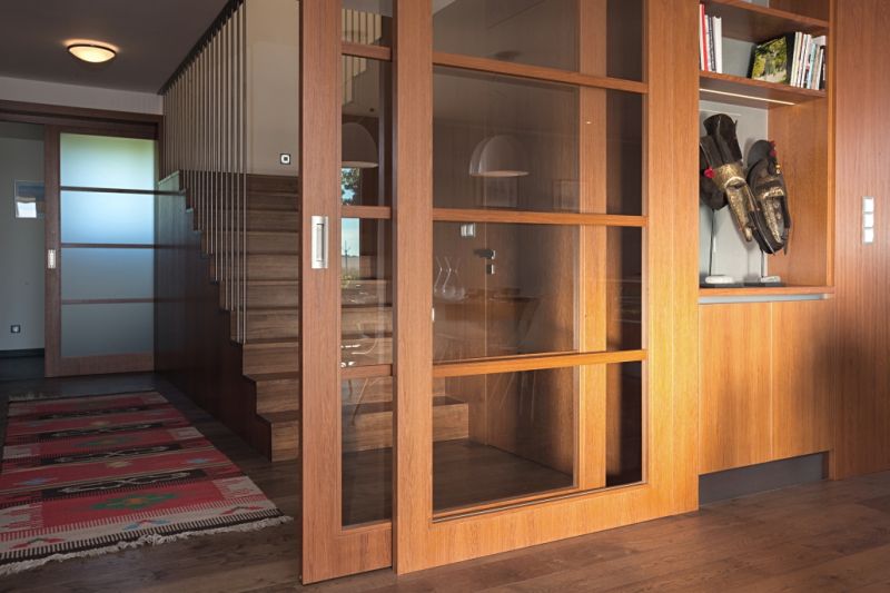 Dominantním prvkem přízemí je promyšlená vestavěná stěna lemující celý obytný prostor – od kuchyně po obývací pokoj. Je vetknuta do niky a obsahuje spoustu úložného místa, ale také třeba knihovnu s televizí a speciálními pojízdnými panely, které mohou televizi překrýt a zamezit, aby se stávala „oltářem" obývacího pokoje. Obývací část opticky odděluje krb, doplňkový zdroj tepla domu. Hlavním zdrojem je kotel na dřevo a teplo distribuuje podlahové vytápění, radiátory tedy nikde nenajdeme. Varný ostrůvek kuchyně je orientován tak, aby kuchař viděl do prostoru. U pracovní plochy na druhé straně však o výhled také nepřichází díky velkému oknu. V patře nechybí zóna pro rodiče i dětské pokoje a pracovna. Důležitým aspektem dispozice je, že funkce některých pokojů se může v čase proměňovat v závislosti na měnících se potřebách obyvatel domu.