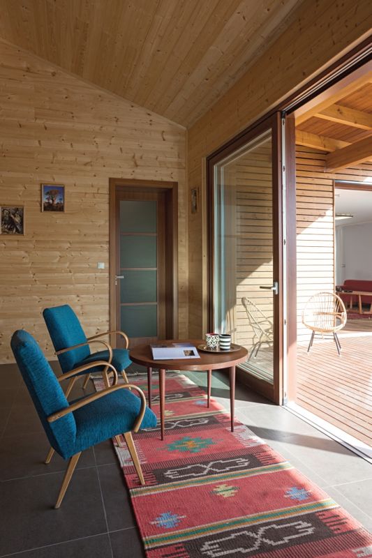 Díky terénnímu zlomu na pozemku vznikl také železobetonový suterén, jehož strop tvoří v podstatě základovou konstrukci vrchní panelové dřevostavby. Materiálovou kombinací tedy nevznikl žádný nestandardní detail, který by nebyl běžný u jiných dřevostaveb.