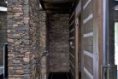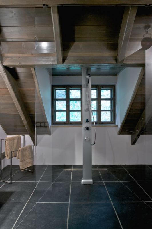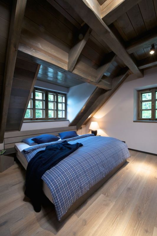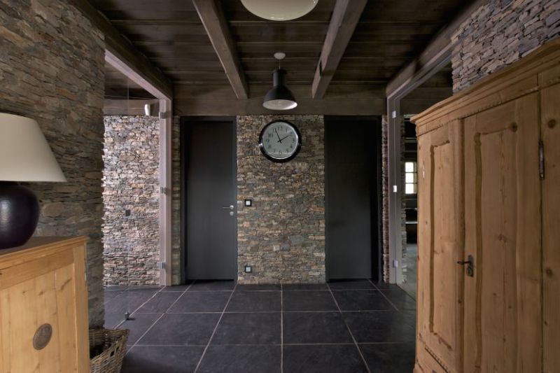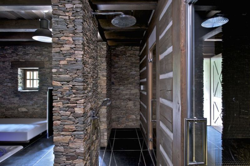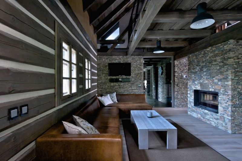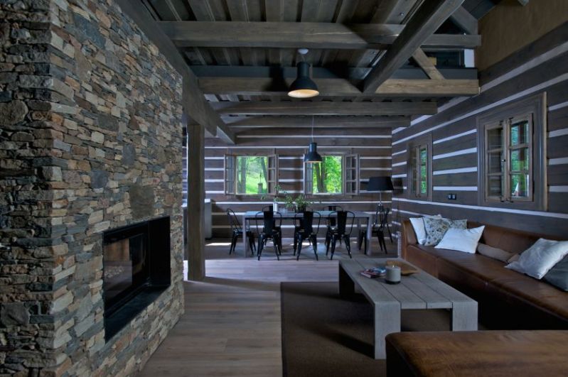 Přírodní kámen, získaný ze základů původní stavby, byl využit opět v nové stavbě. „Využili jsme pouze kámen, původní dřevo nebylo možné použít, a ponechali jsme i některé kamenné části, které se dozdívaly, opravovaly a obnovovaly. Vznikl tak pevný vybetonovaný základ na stejném půdorysu, na němž byla postavena v podstatě klasická roubenka," vysvětluje Rostislav Černík. Místním kamenem zajímavého odstínu jsou obloženy také stěny v domě a samozřejmě i krb, který tvoří v přízemí stabilní kamennou masu, a dále ústí na galerii do lehkého kovového tubusu, jenž působí dekorativně a současně prostor i vytápí.