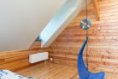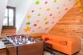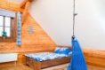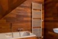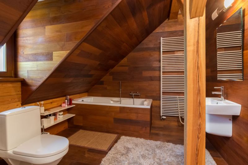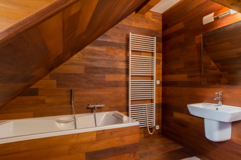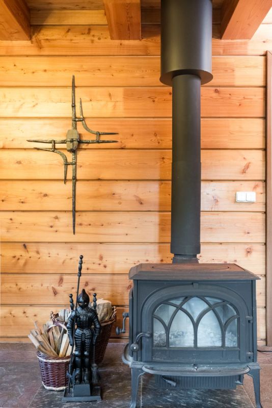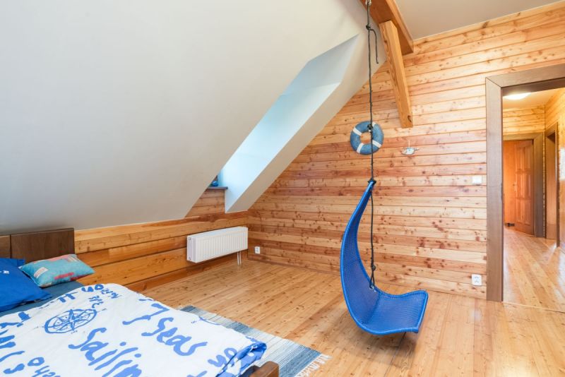 Ústřední místností přízemí je otevřený obytný prostor s kuchyňským koutem, jídelním stolem, obývacím pokojem a krbovými kamny. „Krbová kamna jsou jednou z nejlepších věcí, která se nám podařila. Dávají dostatek tepla, dřevo v nich hoří velmi dlouho, v zimě jimi vytopíme celý prostor v přízemí. Možná by vytopila i horní podlaží, ale mezi pokoji by musely být ve stropě vytvořeny otvory. To jsme zamítli, protože chceme mít ložnice zvukově oddělené." V patře jsou čtyři ložnice a velká koupelna s toaletou. „S koupelnou v podkroví jsem měl trochu problém. Protože je dům dřevěný, měl jsem strach, že obkladačky a jiné podobné materiály budou praskat, takže jsem se nakonec rozhodl pro obložení teakem. Obklad prováděl kamarád, který se tím zabývá, a jsem opravdu velmi spokojený — je to nádhera, dřevo je krásné, vlhkost mu nevadí, naopak, nepraská, nepracuje. Dům máme osm let a loni jsme koupelnu natírali teakovým olejem, ale to je standard, dřevo se prostě udržovat musí."